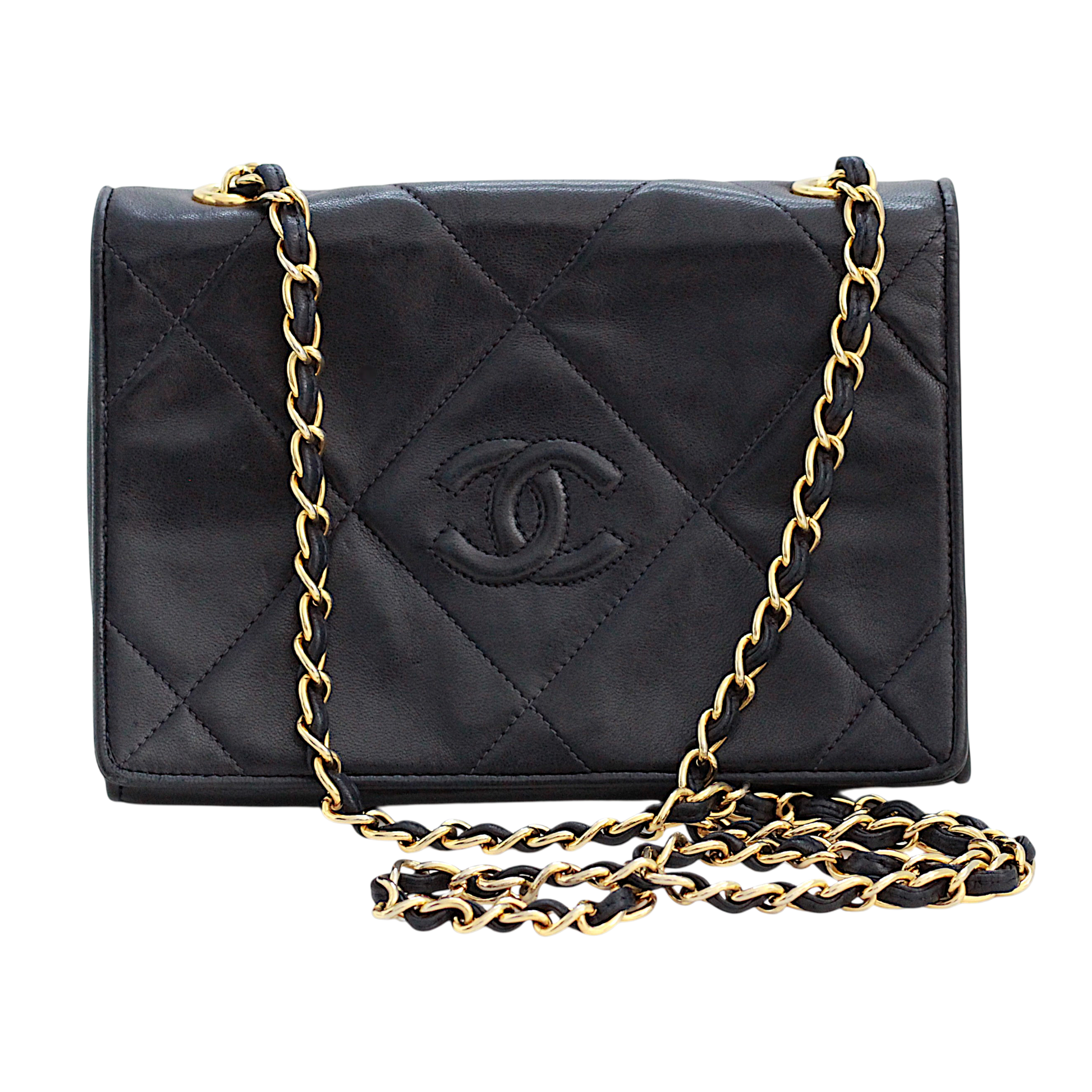 Black lambskin with diamond quilting, 24K gold-plated hardware, leather-interwoven chain strap, and CC stitched logo. Made in France.